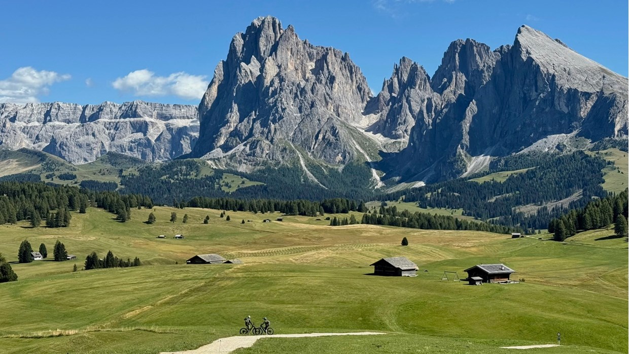Gleich nach dem Frühstück geht es auf der legendären Passstrasse hoch zum Sellajoch mit einzigartigem 360 Grad Panorama. Wir sausen hinunter nach Wolkenstein und kurbeln hoch auf die Seiser Alm - die größte Hochalm Europas. In einer urigen Hütte genießen wir Knödel und den Blick auf die Berge. Übernachtung in Gröden im Grödner Tal.