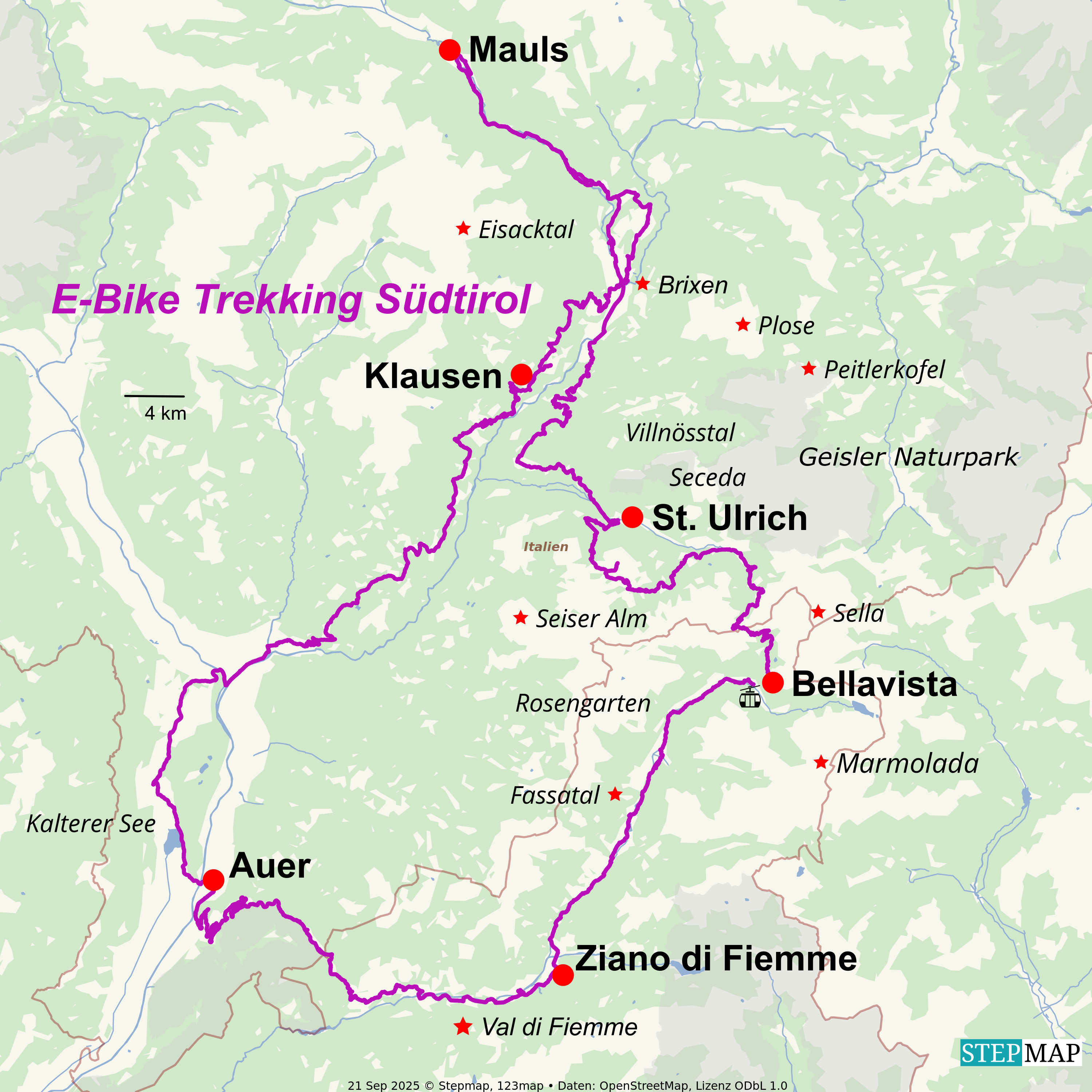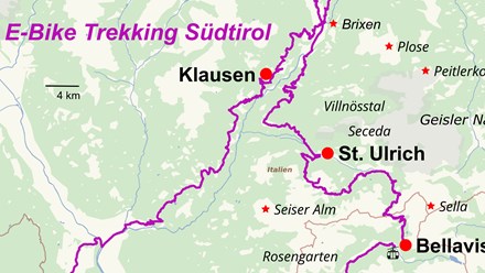 Die E-Bike Transalp Trekking Südtirol hebt eine Level 2 Tour in neue, bisher unbekannte Höhen. Der Sellajoch Pass ist damit nur ein Highlight dieser absoluten Supertour. Wir genießen traumhafte Wege weit oberhalb des Eisacktales, schleifen ab Auer in eine historische Bahntrasse, die uns ins Val di Fiemme führt. Von hier im Fassatal, ganz nah an den Dolomitengipfeln vorbei. Abschluss bildet die Seiser Alm Runde und das Grande Finale nach Brixen und zurück nach Mauls.