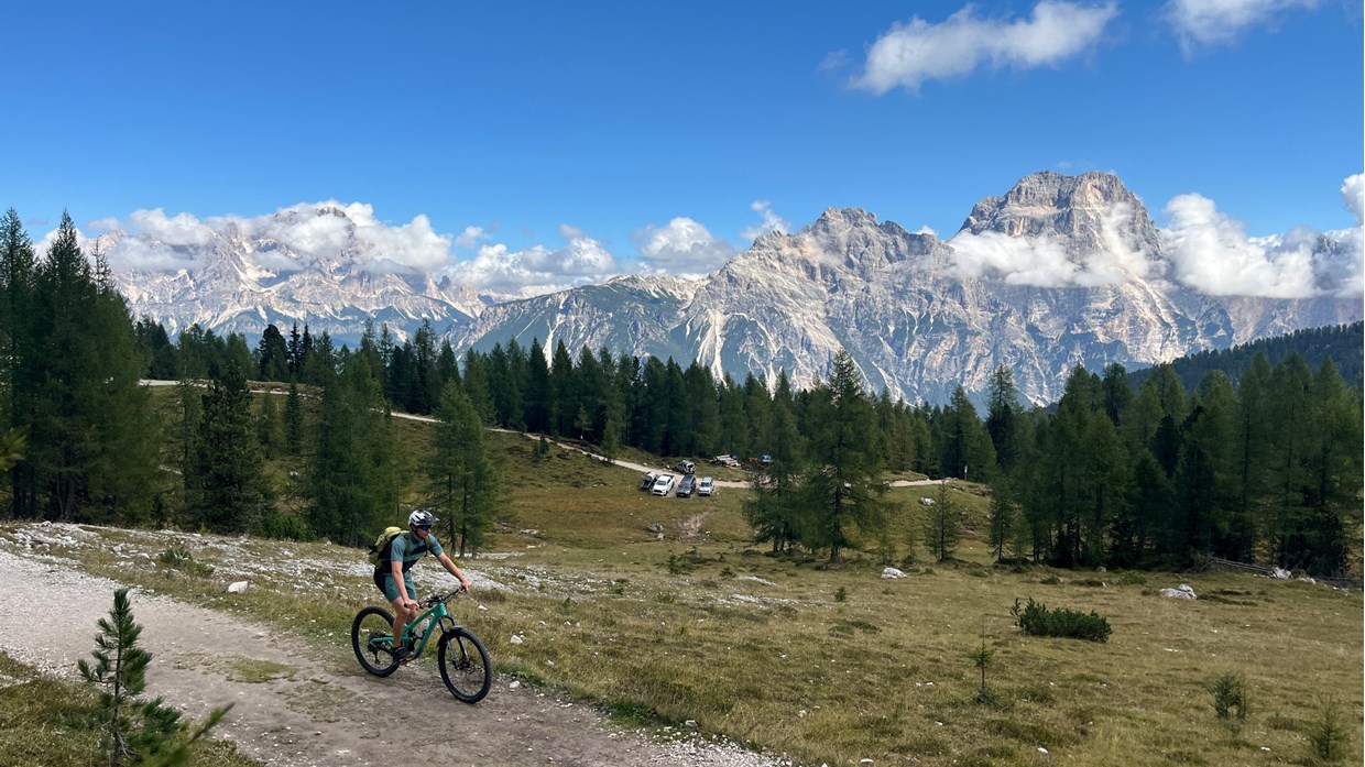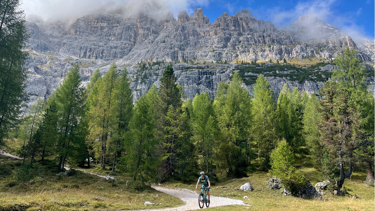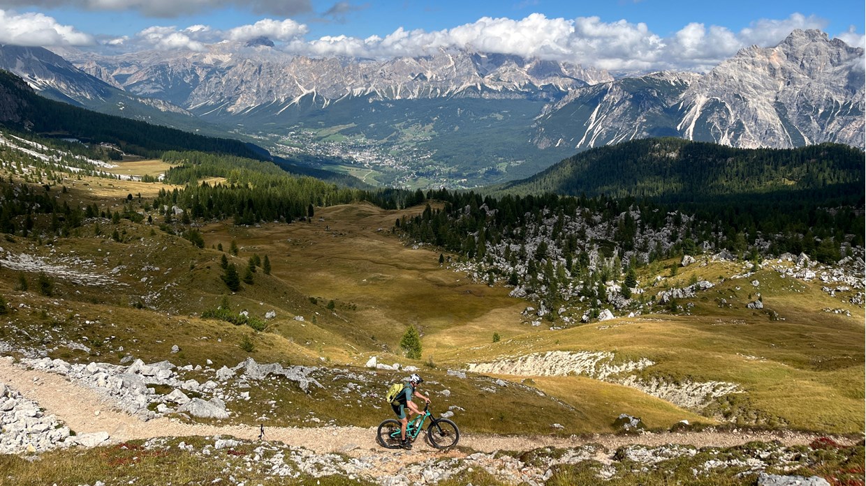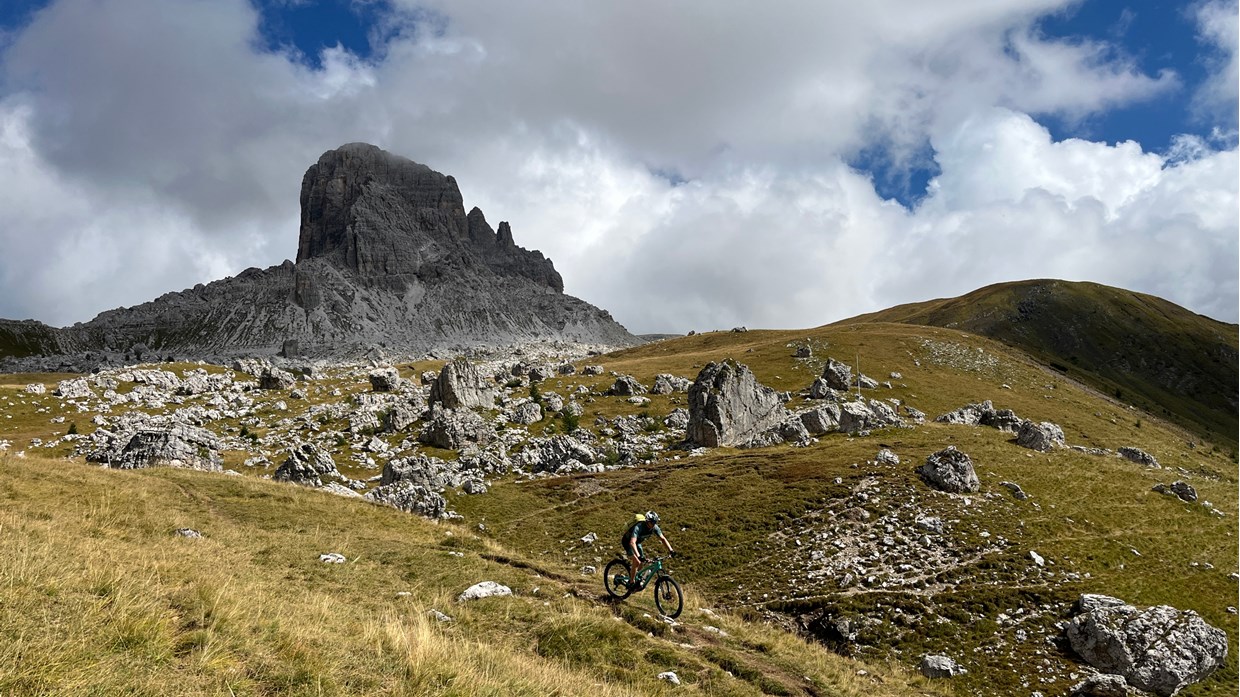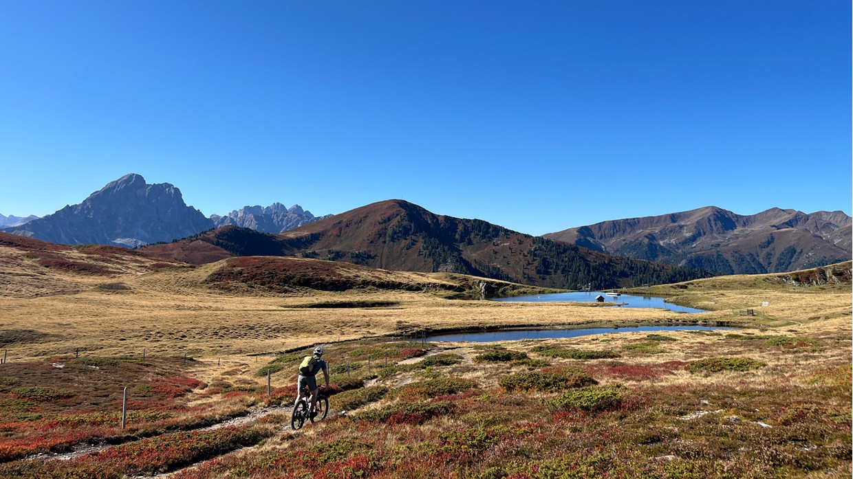 „Jeder Tag bringt die perfekte Abwechslung und ein neues Highlight. Wir starten oberhalb von Brixen, erleben den Hausberg Plose in vollen Zügen. Am nächsten Morgen erwachen wir auf über 2000 Metern. Der Sonnenaufgang darf nicht verpasst werden. Traumtrails und 360 Grad Bergpanorama auf der Lüsener Alm. Blicke vom Stubai bis zum Großglockner, die Dolomitenberge hautnah. Wir gastieren im Olympia Ort Cortina, die Auffahrt zur Rifugio Croda da Lago ist lang und steil. Die Passhöhe liegt auf knapp 2300 Metern. Die natürlich angelegten Bikestrecken im Val di Zoldo sowie im Valle Agordina sind anspruchsvoll. Das Grande Finale dann am letzten Tag – Trailsurfen nach Soligo. Die E-MTB Transalp Civetta ist eine wahre Superlative-Tour. Sehr gute Fahrtechnik und Kondition sind hier jedoch zwingend nötig. Im hochalpinen Gelände sollte man sich wohl fühlen. Transalp Erfahrung Voraussetzung.“