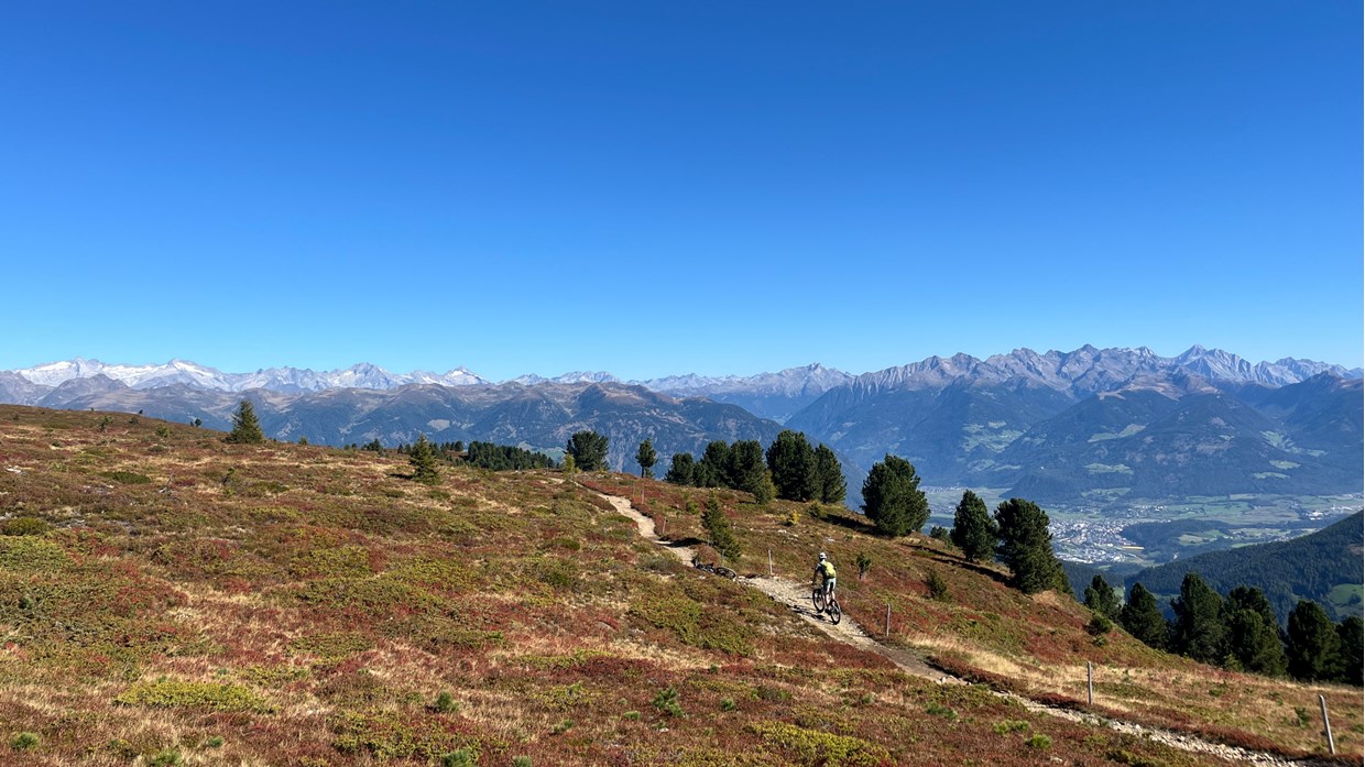 Auftakt oberhalb von Brixen. Über einen ersten Uphill-Trail erreichen wir die Talstation der Plose Seilbahn. Oben angekommen bestaunen wir den Blick zu den Geislerspitzen. Ein anspruchsvoller Biketrail führt uns näher an die Dolomitengipfel. Am Nachmittag auch nochmals ansteigend zu unserer Übernachtung auf der Würzjochhütte. Die Abendstimmung und Übernachtung auf über 2000 Meter Höhe ist traumhaft.
